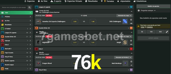 O 76k oferece uma grande seleção de opções de apostas em e-sports com probabilidades competitivas